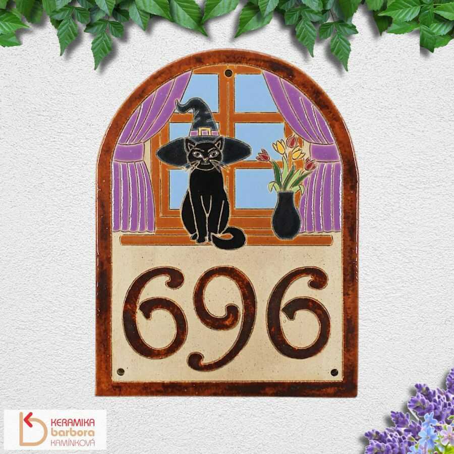 Ručně ryté a malované keramické domovní číslo na fasádu či zeď s černou kočkou a čarodějnickým kloboukem je vtipným dárkem pro majitele černých koček nebo všech, kteří mají rádi magii a kouzla.
