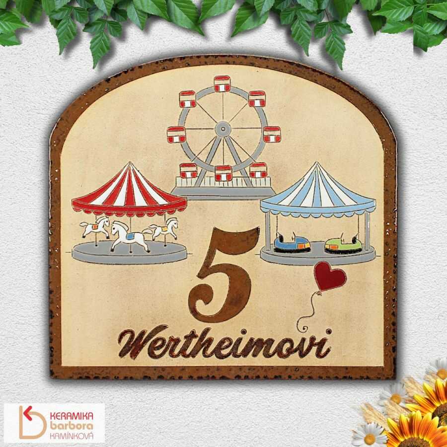 Ručně ryté a malované keramické domovní číslo s kolotoči potěší každého, kdo si rád hraje a kdo si zavzpomíná na dětství.