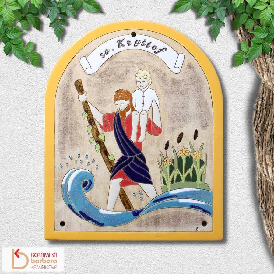 Keramický kachel s obrázkem svatého Kryštofa, patrona cestovatelů, poutníků, řidičů a ochránce na cestách.