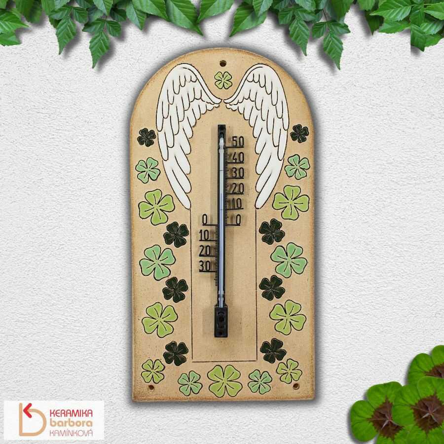 Ručně rytý a malovaný keramický venkovní teploměr se čtyřlístky a andělskými křídly potěší každého, komu přejeme štěstí a ochranu.